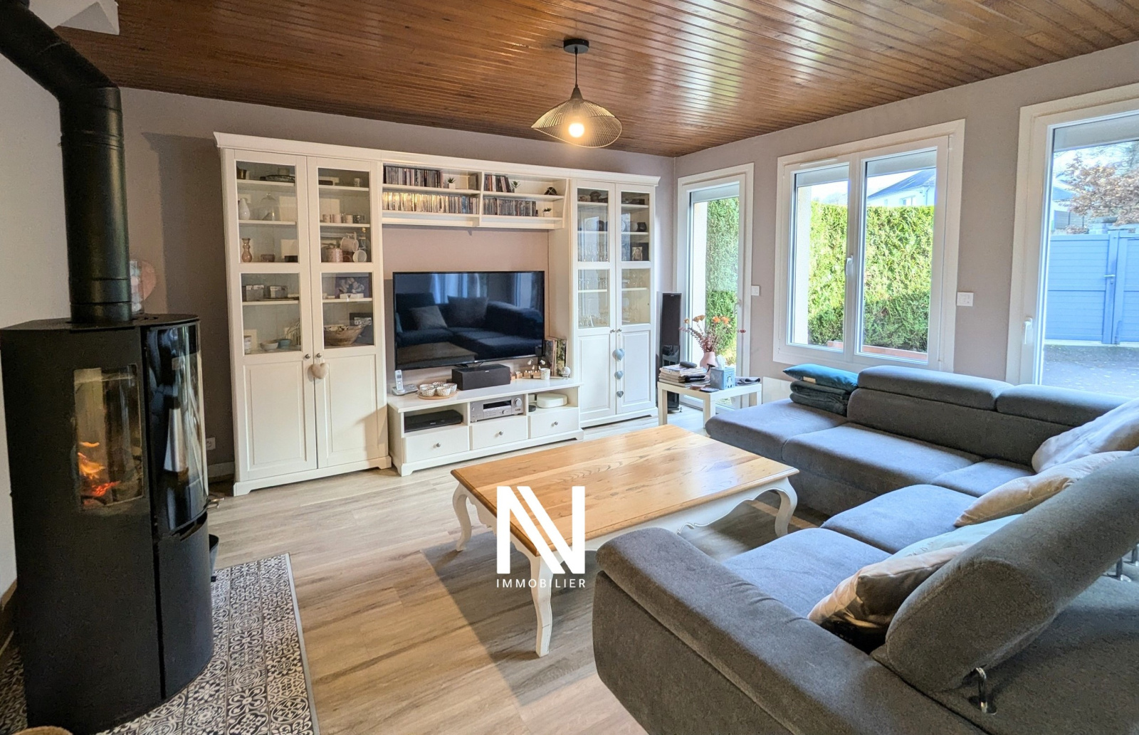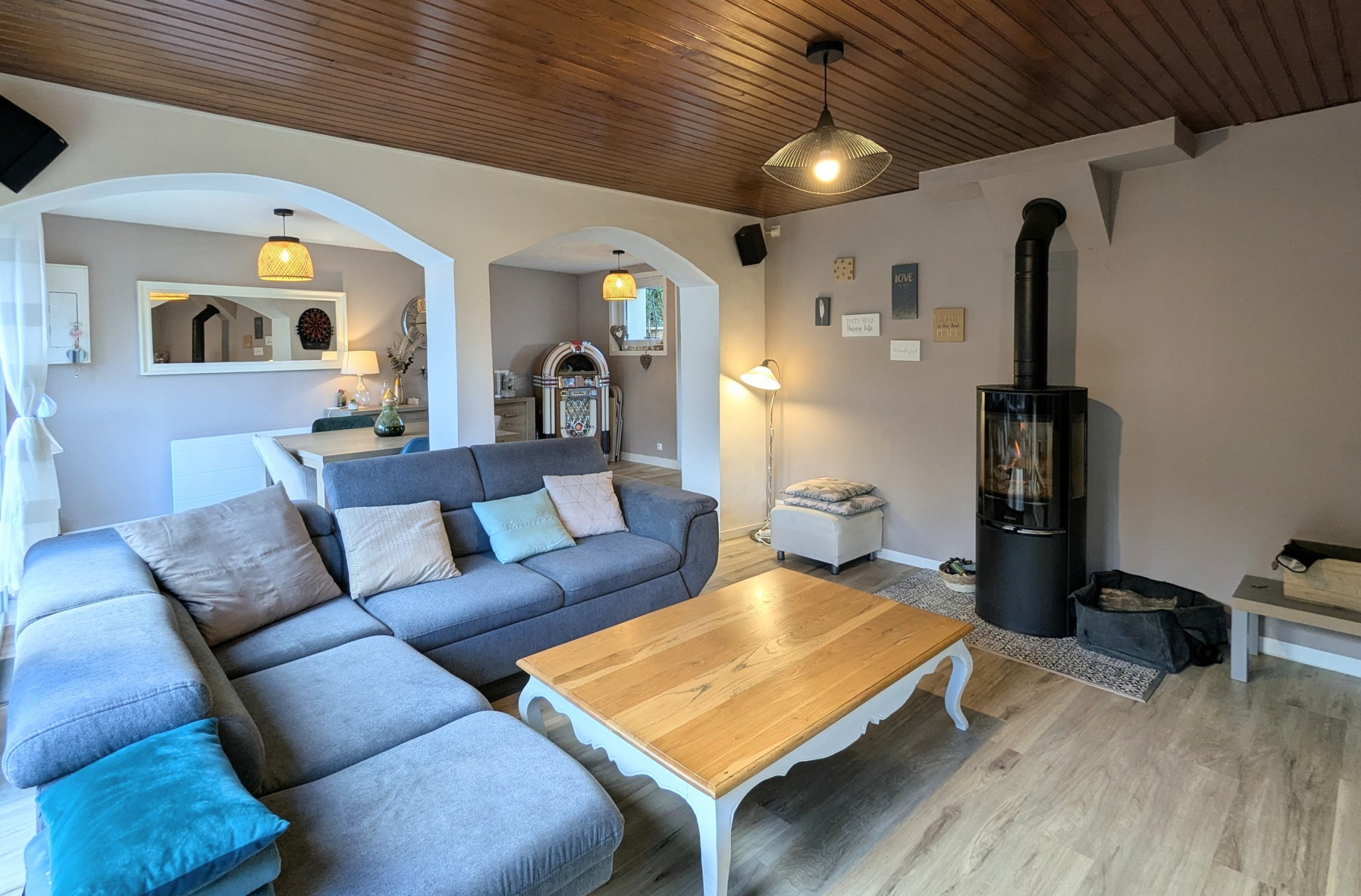 d'un séjour-salon chaleureux agrémenté d'un poêle à bois
