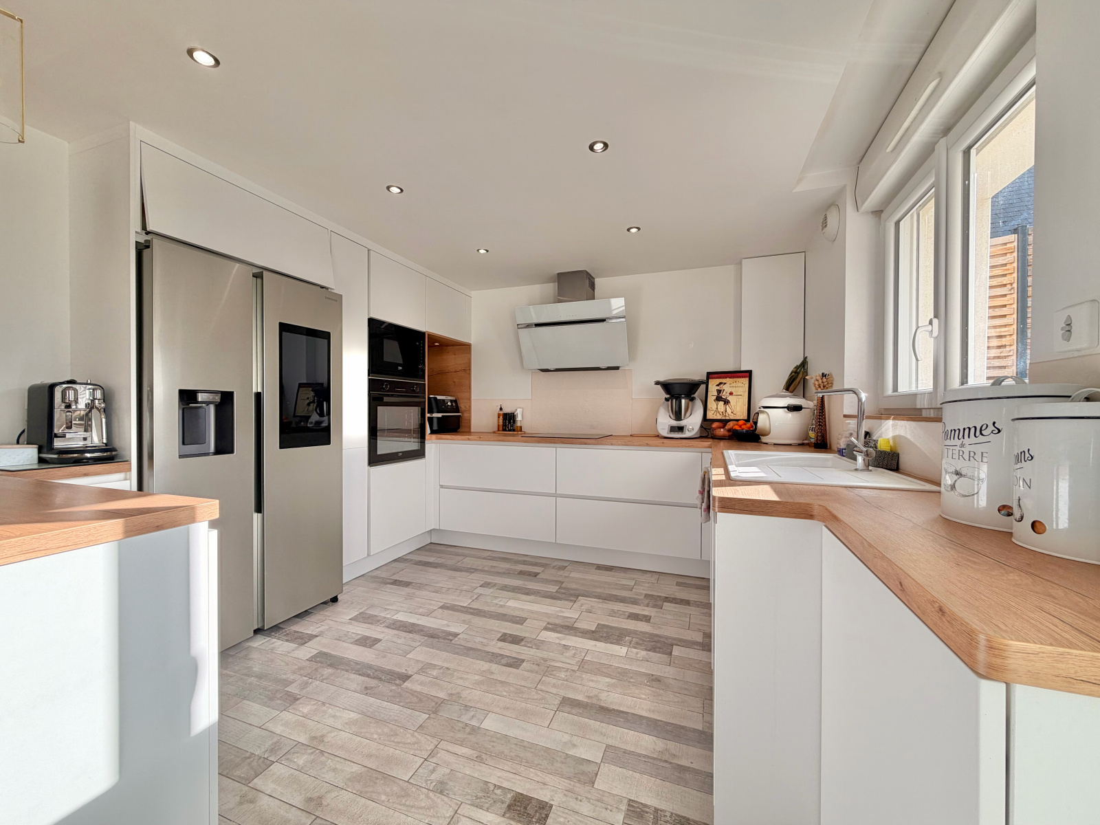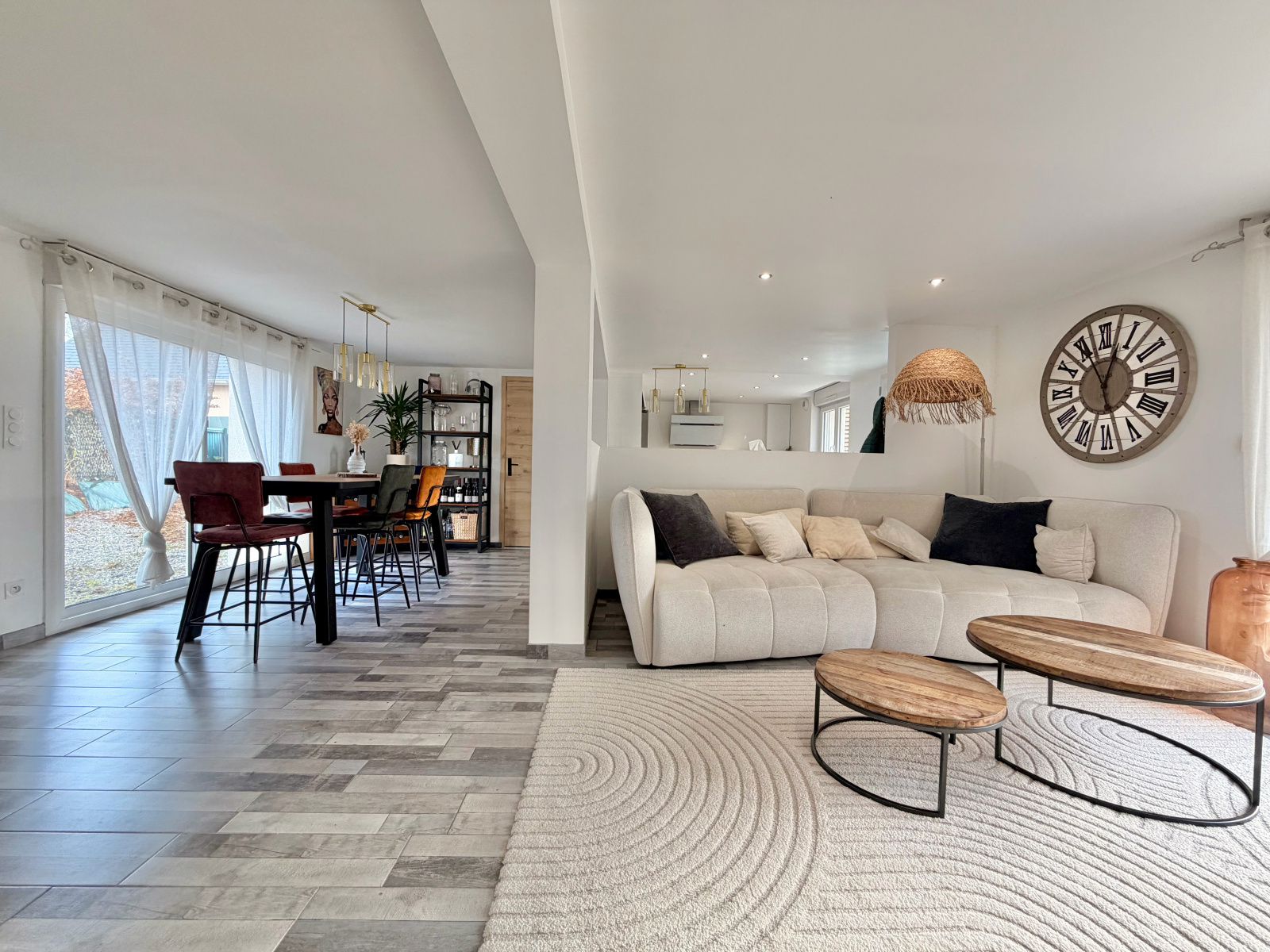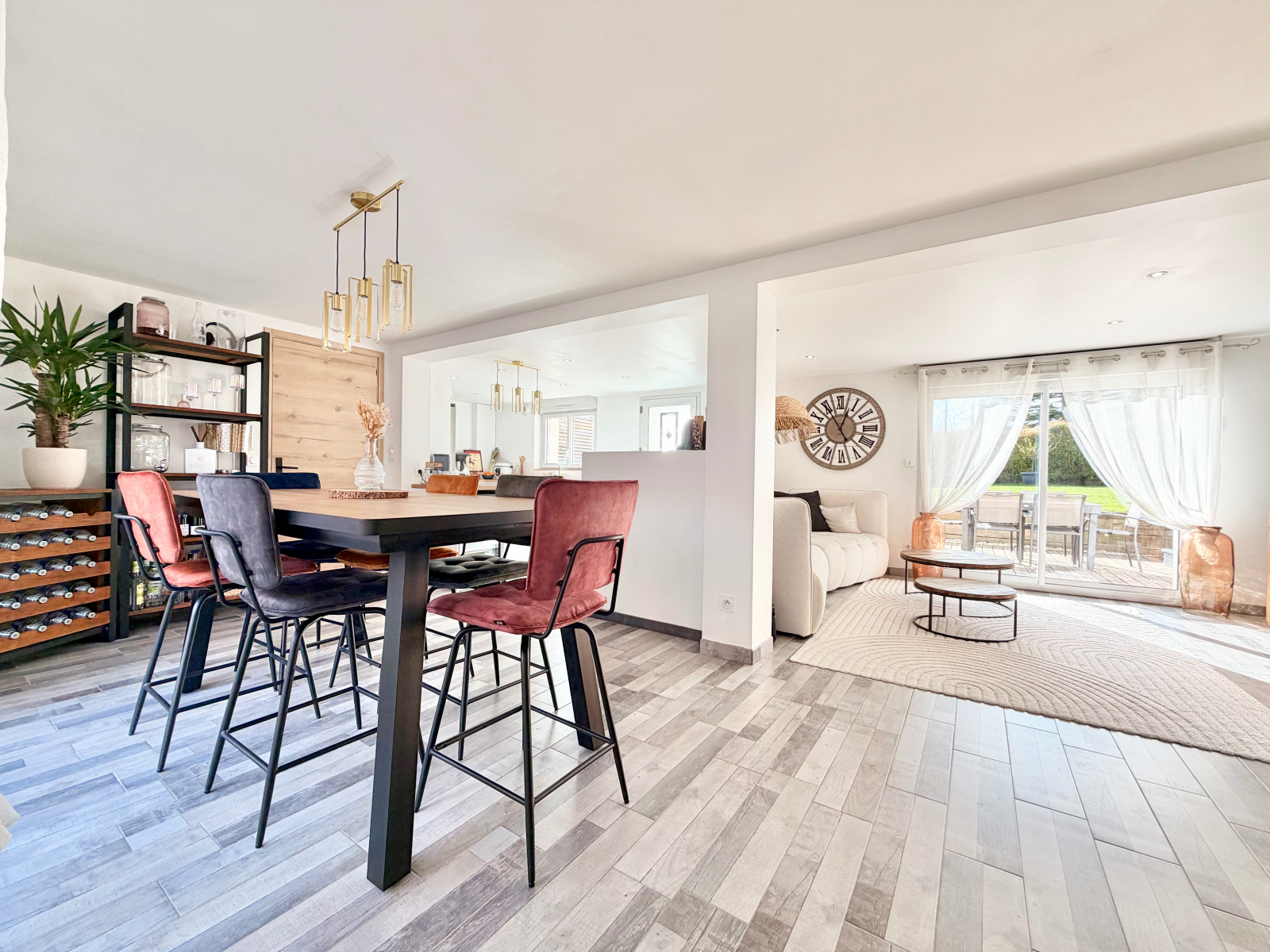 Le rez-de-chaussée propose une vaste pièce de vie lumineuse articulée en trois espaces — cuisine, salle à manger et salon — complétée par une arrière-cuisine/buanderie, une salle d’eau avec WC.