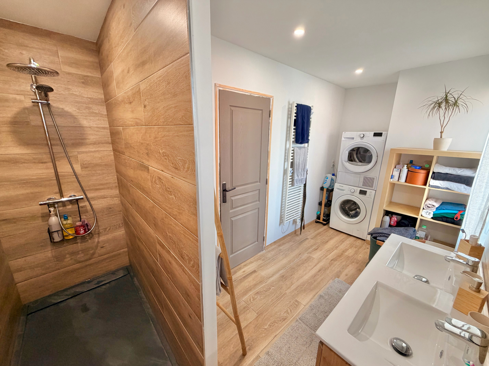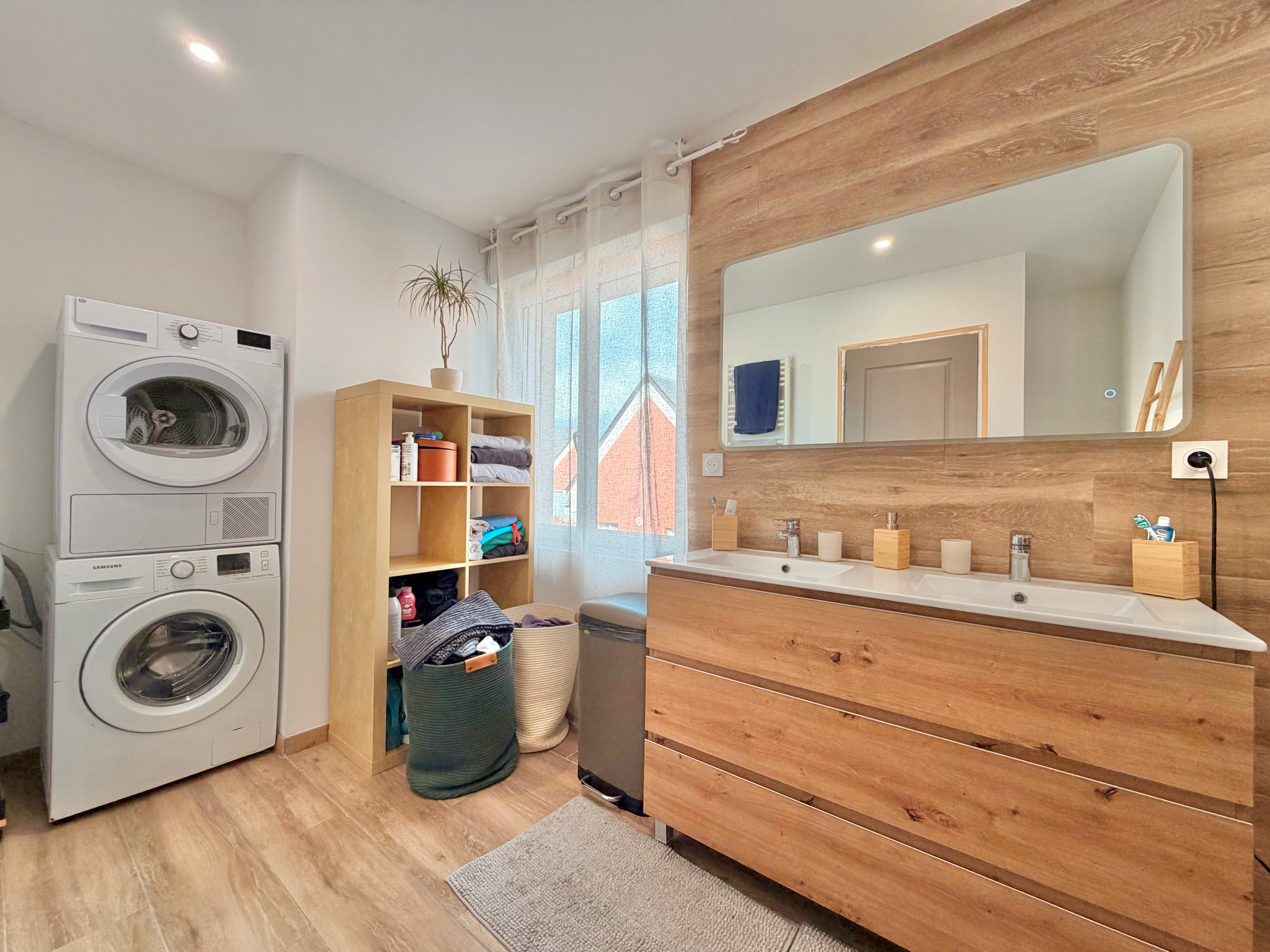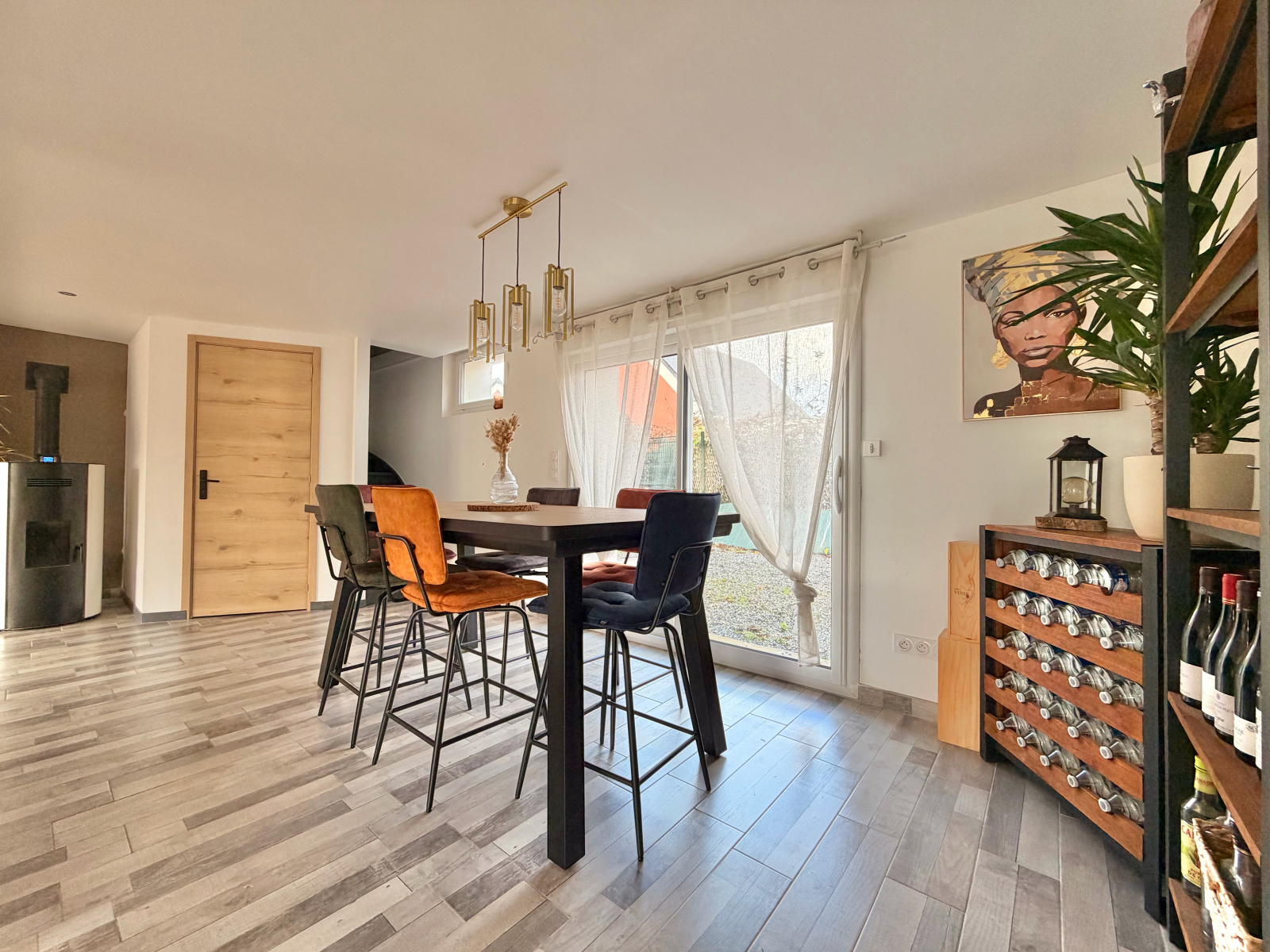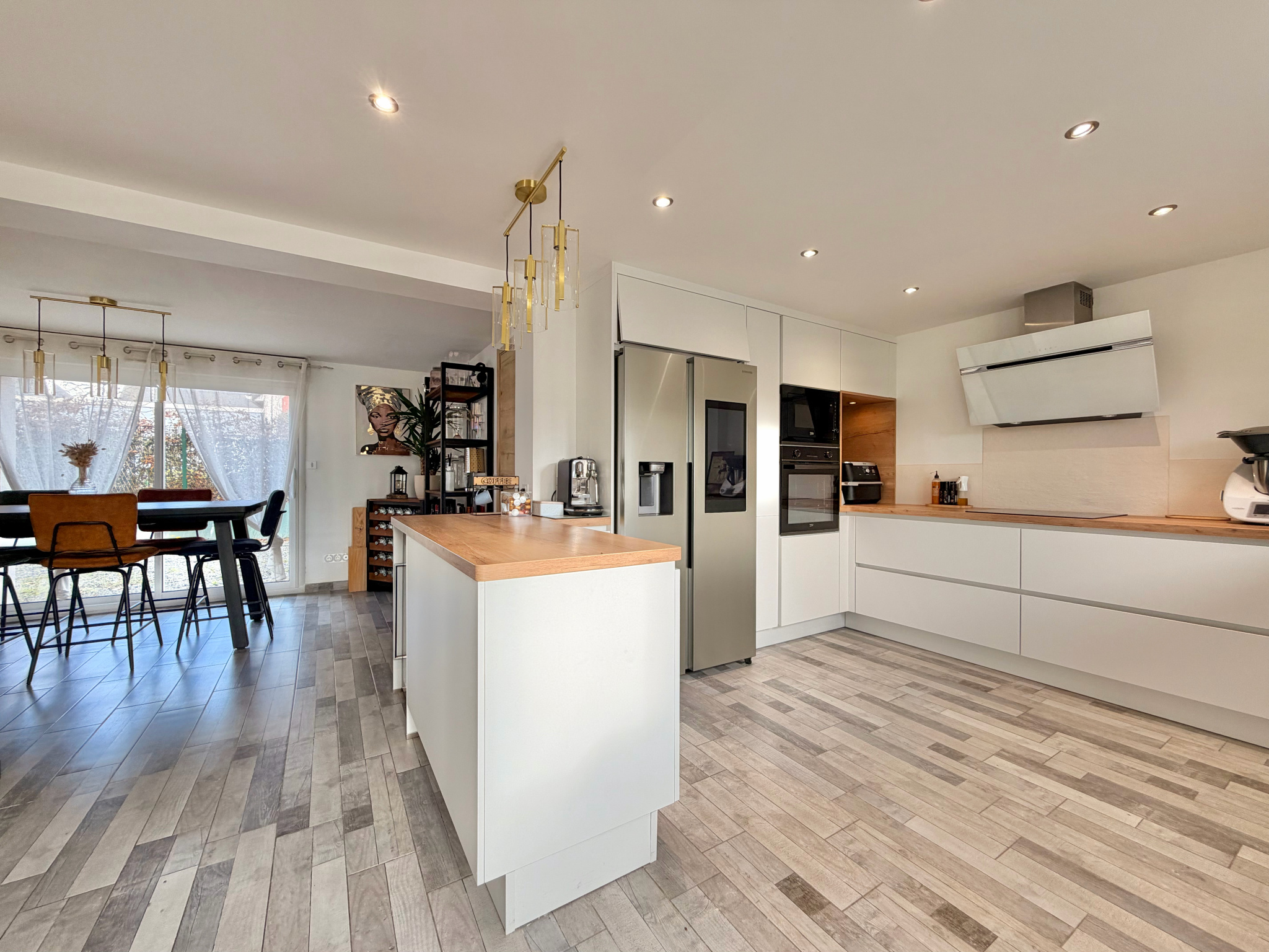 Le rez-de-chaussée propose une vaste pièce de vie lumineuse articulée en trois espaces — cuisine, salle à manger et salon — complétée par une arrière-cuisine/buanderie, une salle d’eau avec WC.