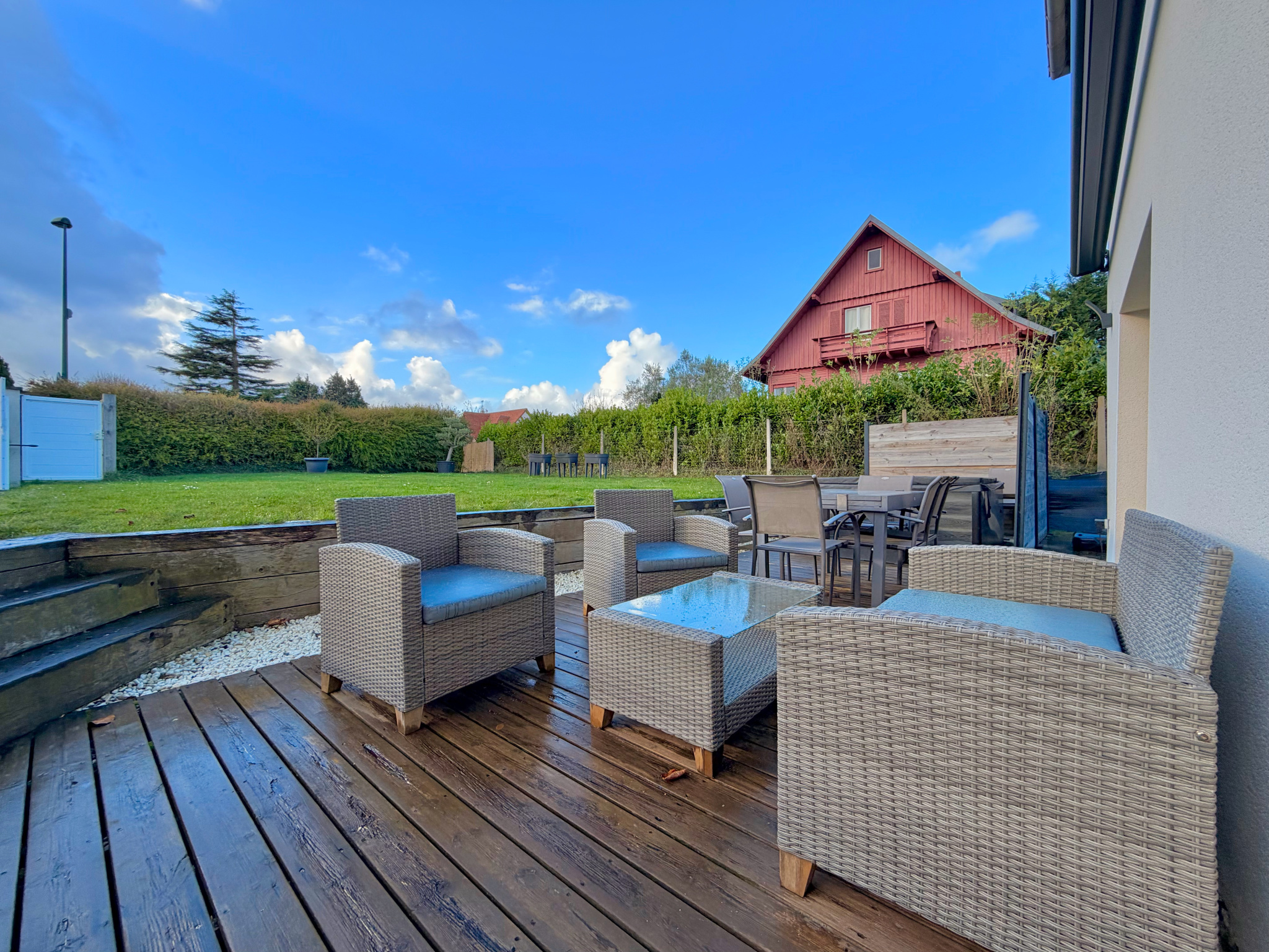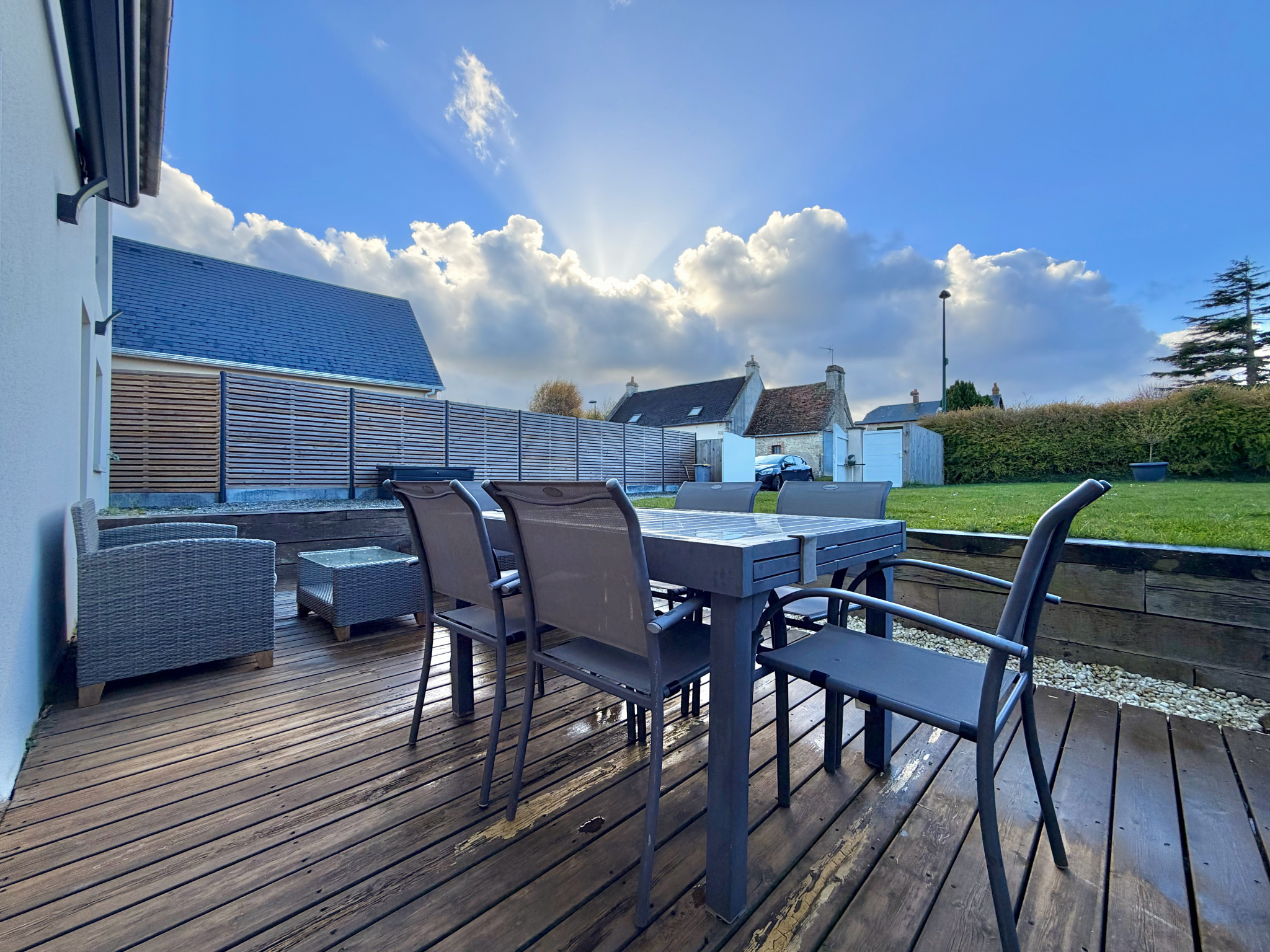 Côté jardin une terrasse ensoleillée s'accèdant depuis la pièce de vie vous permettra de profiter en toute quiétude. Une dalle béton existante pourra être utilisée tant en espace de détente que pour servir de base à un garage ou carport.