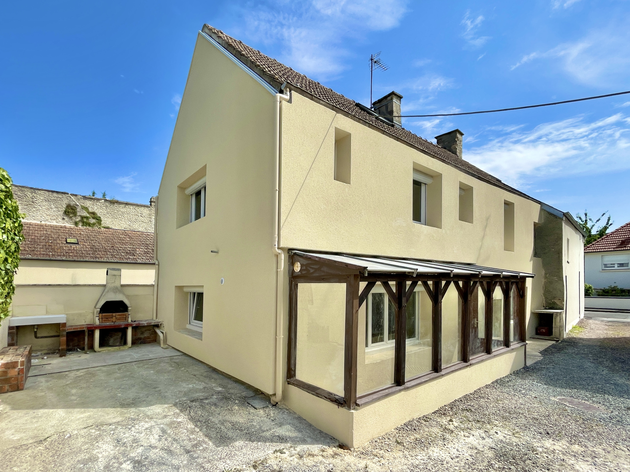 Maison d’environ 100 m² avec dépendances : garage, atelier et terrasse extérieure.